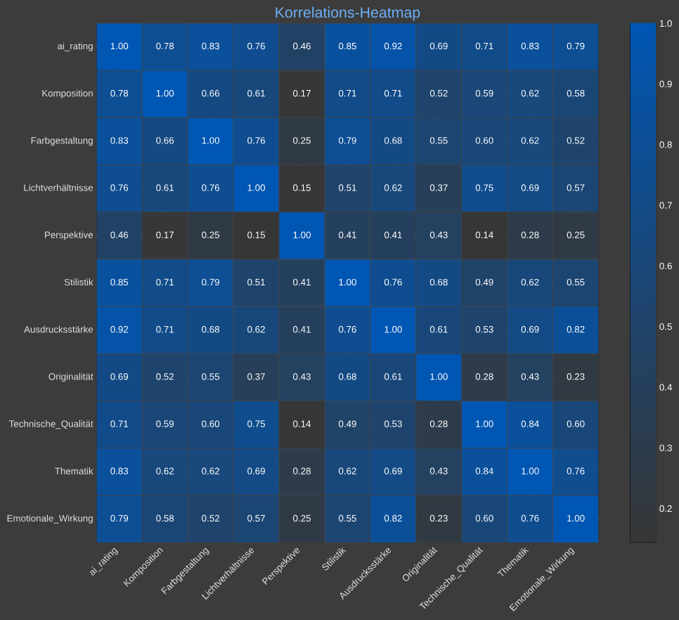 ai_rating | Komposition | Farbgestaltung | Lichtverhältnisse | Perspektive | Stilistik | Ausdrucksstärke | Originalität | Technische_Qualität | Thematik | Emotionale_Wirkung | |
