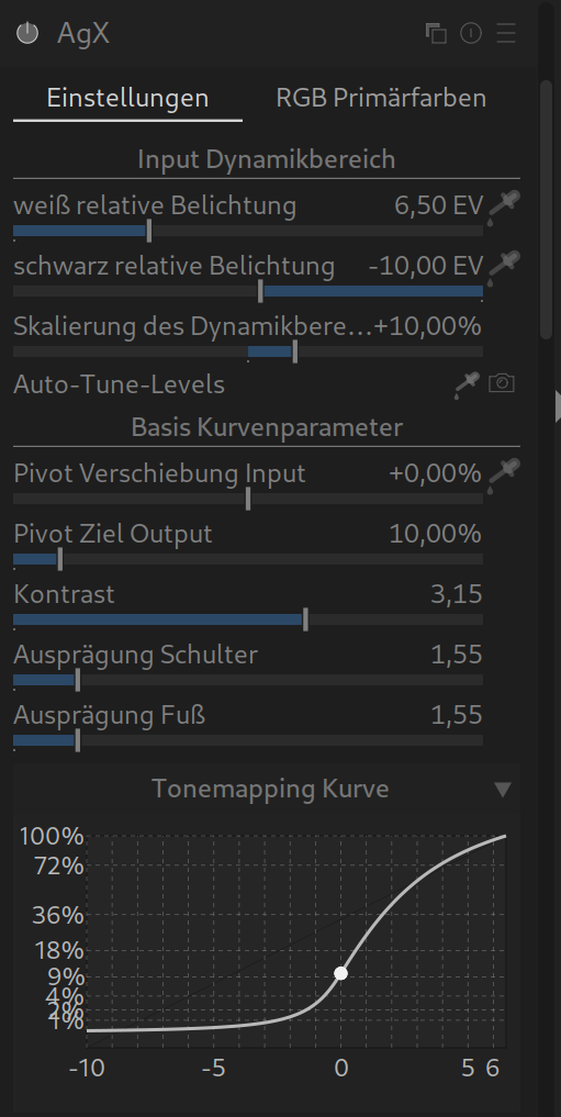 | a | AgX (Einstellungen | Einstellung zurücksetzen | Camera | Pivot Verschiebung Input | Pivot Ziel Output | Kontrast am Pivot | Zielwert Schwarz | Zielwert Weiß |