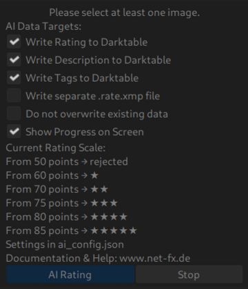 - Daten schreiben: Basierend auf einer ebenfalls konfigurierbaren Skala wird der Score in eine Sterne-Bewertung (0-5) umgewandelt. Die detaillierte Analyse, die Bewertung und die Schlagwörter werden anschließend direkt in darktable (DB & XMP) und optional in eine separate *.rate.xmp-Datei geschrieben.