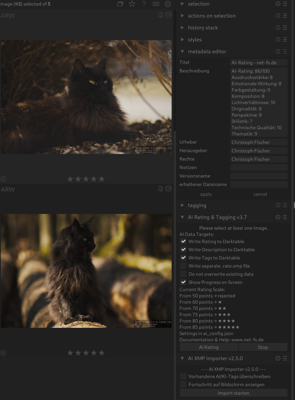 - Ergebnisse prüfen: Ratings, Tags und Beschreibungen erscheinen in darktable. XMP-Dateien werden neben den Originalen gespeichert.